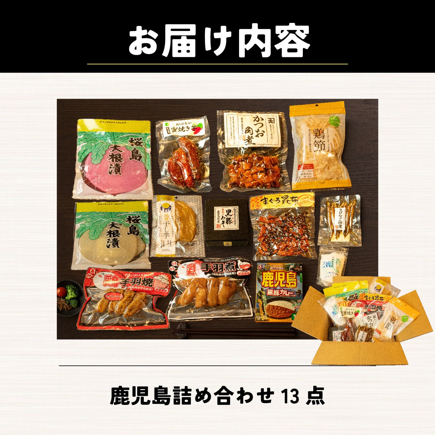 干し芋(紅はるか)130g・黒豚みそ150g・桜島大根漬(うめず味)200g・まぐろ昆布170g・きびなごの佃煮70g・桜島大根漬(しそ味)200g・焼き芋(紅はるか)200g・るるぶ鹿児島黒豚カレー180g・鶏手羽焼(塩こしょう味)200g・かつお角煮75g・とろとろ手羽煮300g・味付鶏節15g・渚のあま塩125g 各1点