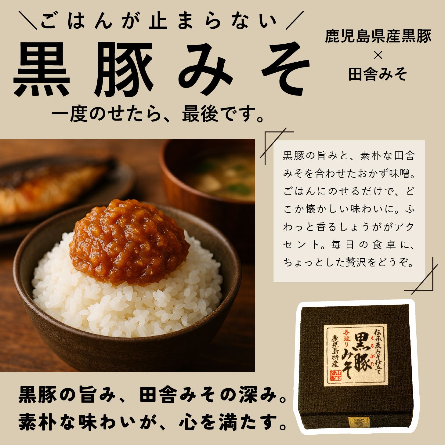 【黒豚みそ】麦味噌(大豆、はだか麦、食塩、国内製造)、砂糖、黒豚肉、生姜、ごま