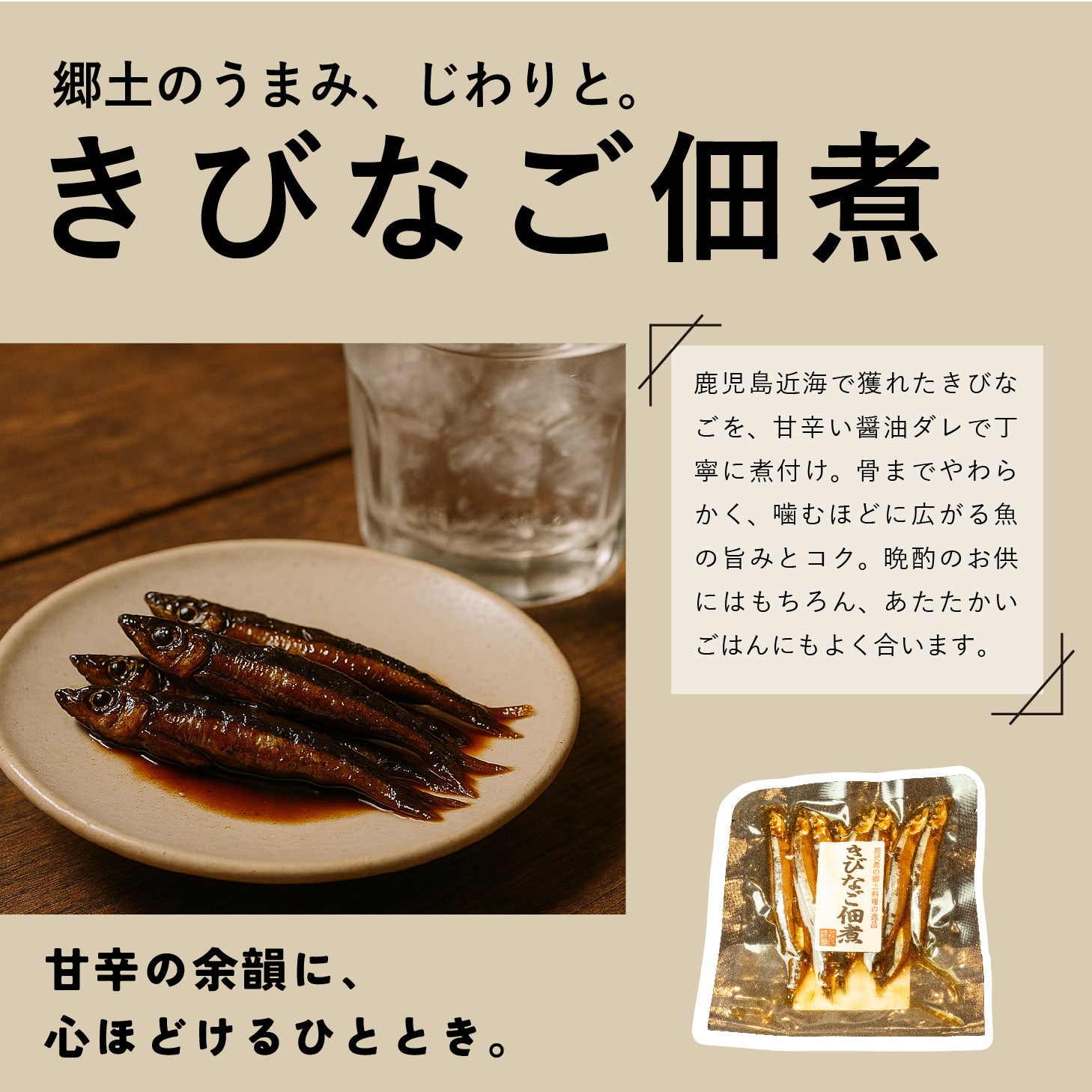 【きびなご佃煮】きびなご(国産)、還元水飴、醤油(大豆・小麦を含む)、水飴、砂糖、みりん、生姜、寒天/調味料(アミノ酸等)